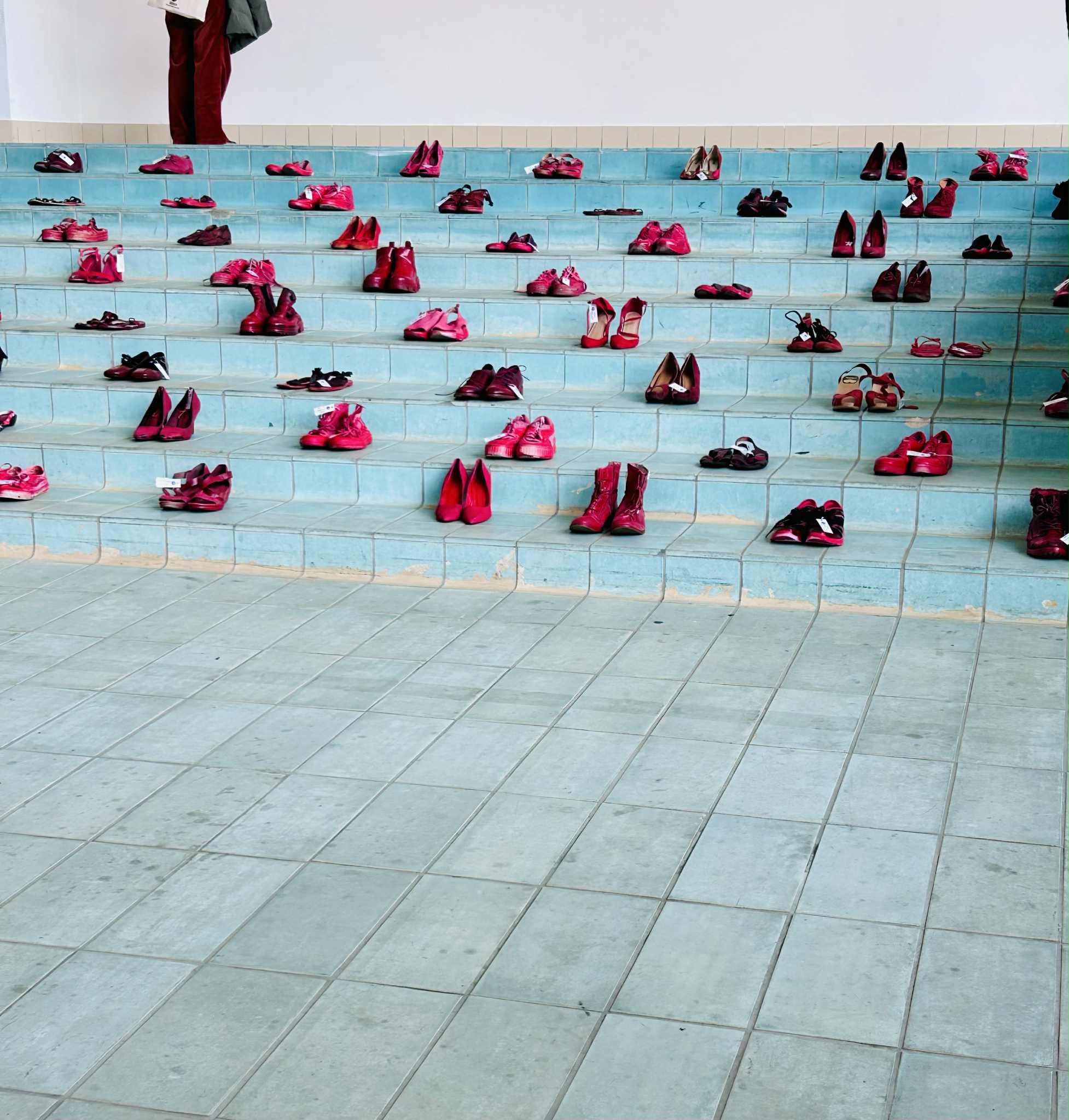 A Bruxelles, l’artiste nous a présenté son travail avec le soin d’offrir un temps avant et après la découverte de son œuvre pour discuter en petit groupe, partager, sensibiliser, informer sur les féminicides et ce qu’ils représentent en Belgique aujourd’hui, la non-considération des victimes du commissariat au jugement, les multiples épreuves pour celleux qui restent.